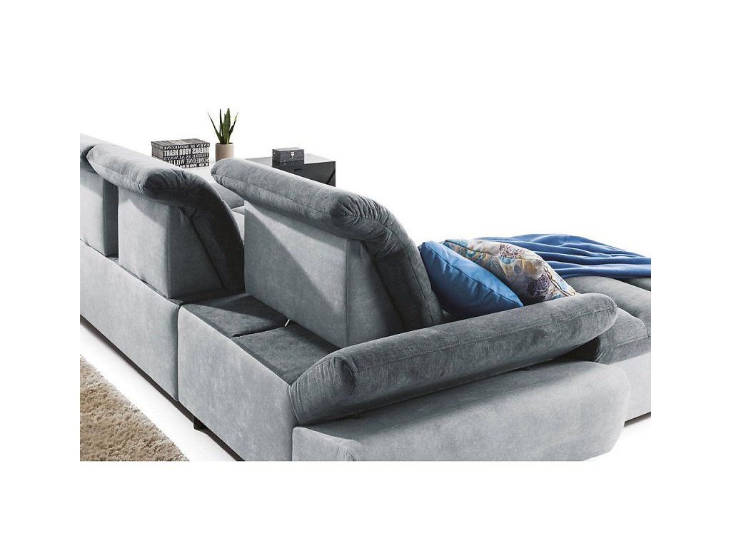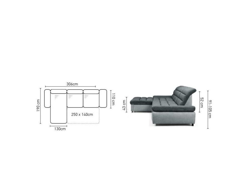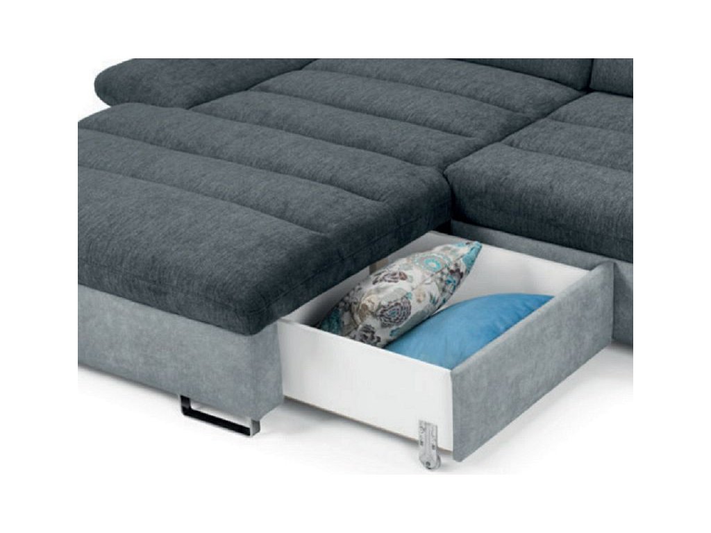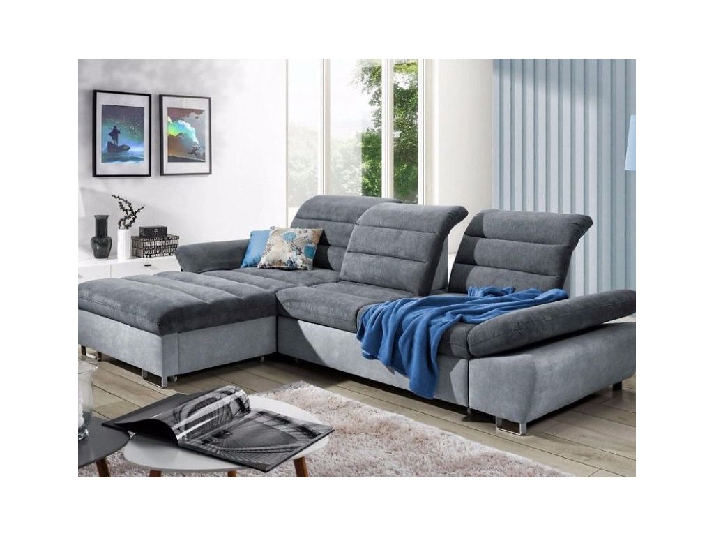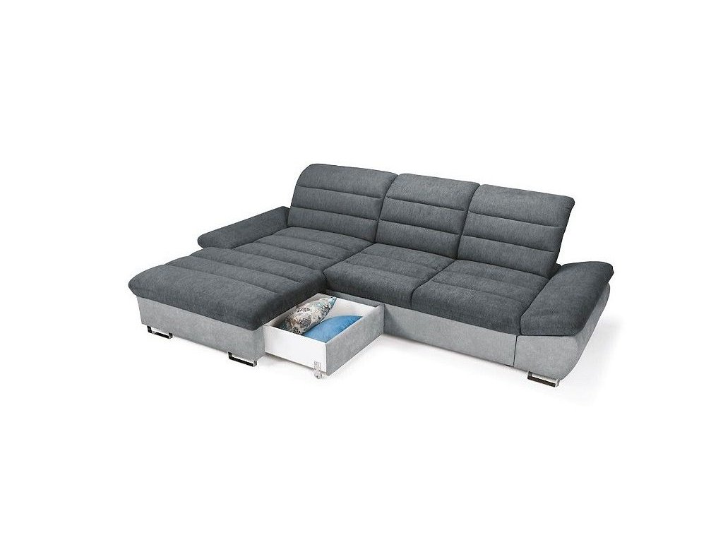 Rohová sedací souprava je očalouněná potahovou látkou Aquaclean Power 11 světle šedá a Power 14 tmavě šedá.
